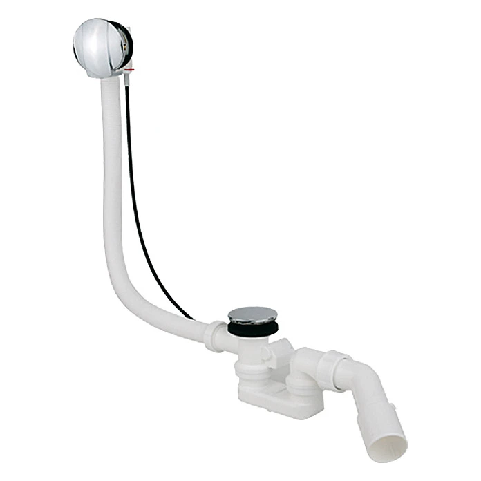 Diese Ab- und Überlaufgarnitur mit Exzenter ist für handelsübliche Badewannen geeignet. Das Überlaufrohr ist flexibel und damit passgenau und problemlos zu montieren. Am Überlauf ist ein Drehknopf befestigt mit dem sich der Stöpsel zum Ablauf öffnen lässt. Somit muss nicht in das Wasser gegriffen werden, um den Auslass zu öffnen. Das Abgangsrohr hat einen 40 mm und einen 50 mm Anschluss und kann problemlos mit HT-Rohren verlängert werden.