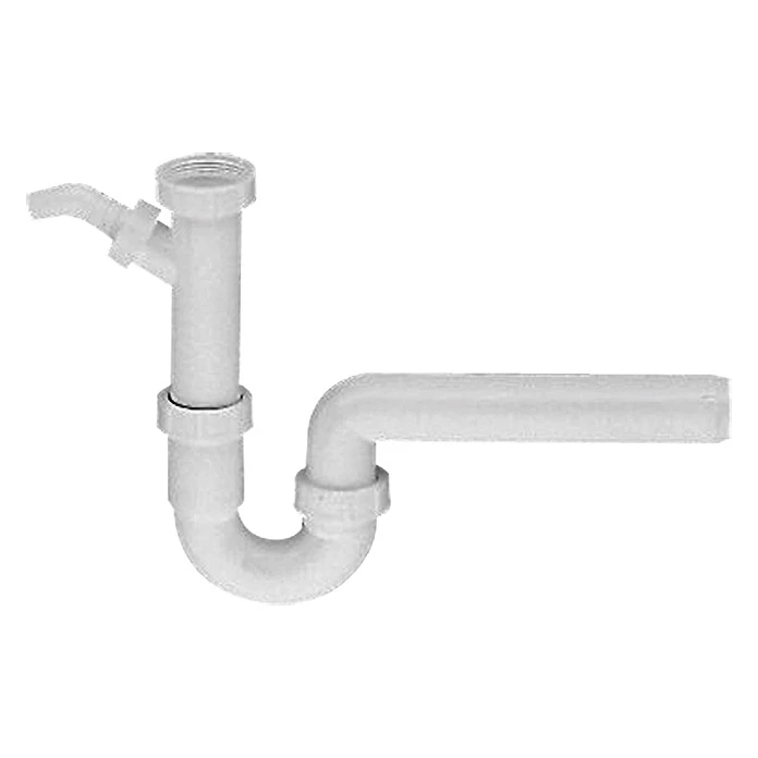 Diese Ablaufgarnitur ist als Spülensiphon geeignet. Sie verfügt über einen Maschinenanschluss zur Montage von Ablaufschläuchen. Der Anschluss für das Spülenventil beträgt 1½ Zoll und der Abgangsbogen, der das Abwasser zur Wand führt hat einen Durchmesser von 50 mm. Die Rohre sind problemlos mit einer Metallsäge kürzbar und mit handelsüblichen HT-Rohren verlängerbar.
