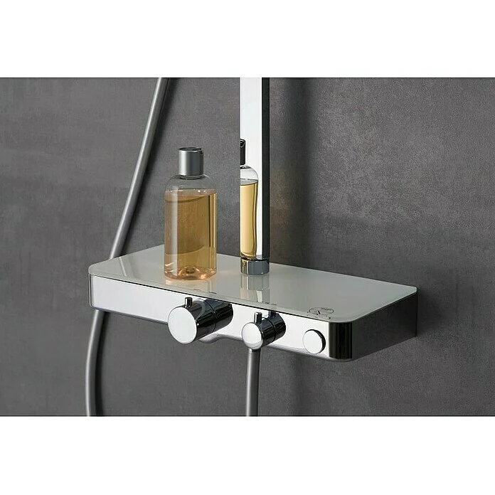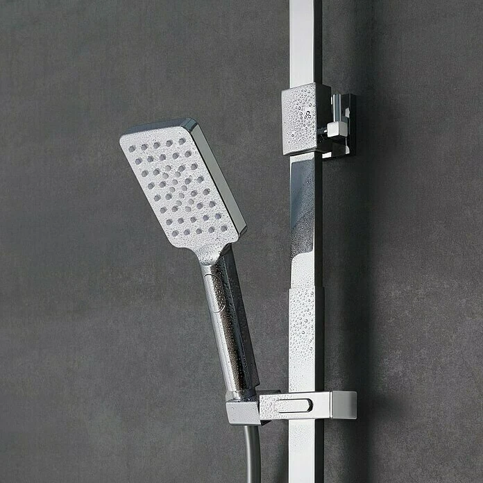 Das Duschsystem Grande Vita von Camargue ist die perfekte Lösung für ein luxuriöses Duscherlebnis mit Kopf- und Handbrause. Mit diesem Thermostat-Duschsystem können Sie vollkommen entspannt in den Tag starten. Das komfortable Komplettset besteht aus einer superflachen Edelstahl-Kopfbrause und einer vollverchromten Handbrause. Natürlich ist auch ein höhenverstellbares Steigrohr und ein Brauseschlauch Bestandteil des Duschsystems. Mit Hilfe der beständigen Thermostatarmatur kann die Wunsch-Temperatur in Bruchteil einer Sekunde erreicht und über die gesamte Duschdauer gehalten werden. Auf der eleganten Ablagefläche aus Glas lassen sich Duschgel und Shampoo dekorativ platzieren. Sehr praktisch sind die Antikalk-Noppen, die Kalkablagerungen an den Strahlöffnungen der Brausen dauerhaft verhindern.