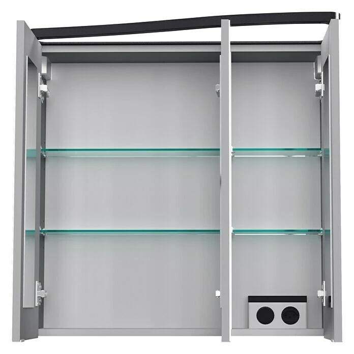 - 3 Kristallglas-Spiegeltüren, 4 Glaseinlegeböden, LED-Beleuchtung, Schalter, CH-Steckdose, 1 Mittelwand