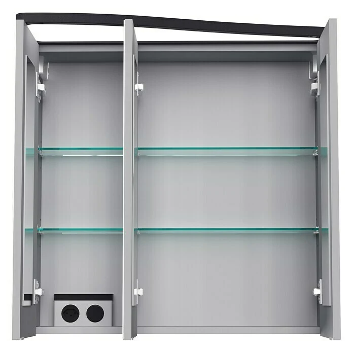 - 3 Kristallglas-Spiegeltüren, 4 Glaseinlegeböden, LED-Beleuchtung, Schalter, CH-Steckdose, 1 Mittelwand