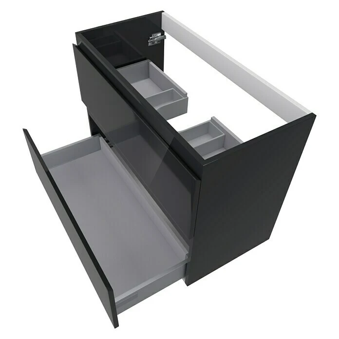 Der Waschbeckenunterschrank Espacio Gama von Camargue zeichnet sich durch modernes und elegantes Design aus. Der Unterschrank ist mit zwei grifflosen Schubladen versehen, die aufgrund ihrer schlichten modernen Optik für mehr Attraktivität in Ihrem Badezimmer sorgen. Zudem bieten die zwei Schubladen viel Stauraum für Ihre Handtücher und Badaccessoires. Dank der integrierten Softclose-Funktion lassen sich die Auszüge des Unterschrankes nahezu geräuschlos öffnen und schliessen. Sowohl die Front, als auch der Korpus sind beidseitig lackiert. Zur einfachen Montage wird der Waschbeckenunterschrank komplett vormontiert geliefert. Die Serie Espacio ist ein Teil eines Baukastensystems, mit dem Sie unzählige Module und Elemente nach Ihren Wünschen individuell zusammenstellen können. Ausserdem lassen sich die Einzelelemente in verschiedenen Farbvariationen kombinieren.