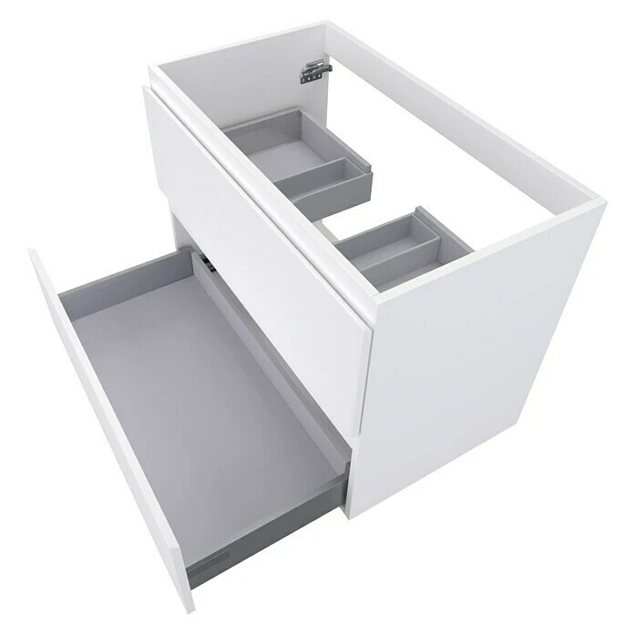 Der Waschbeckenunterschrank Espacio Gama von Camargue zeichnet sich durch modernes und elegantes Design aus. Der Unterschrank ist mit zwei grifflosen Schubladen versehen, die aufgrund ihrer schlichten modernen Optik für mehr Attraktivität in Ihrem Badezimmer sorgen. Zudem bieten die zwei Schubladen viel Stauraum für Ihre Handtücher und Badaccessoires. Dank der integrierten Softclose-Funktion lassen sich die Auszüge des Unterschrankes nahezu geräuschlos öffnen und schliessen. Sowohl die Front, als auch der Korpus sind beidseitig lackiert. Zur einfachen Montage wird der Waschbeckenunterschrank komplett vormontiert geliefert. Die Serie Espacio ist ein Teil eines Baukastensystems, mit dem Sie unzählige Module und Elemente nach Ihren Wünschen individuell zusammenstellen können. Ausserdem lassen sich die Einzelelemente in verschiedenen Farbvariationen kombinieren.