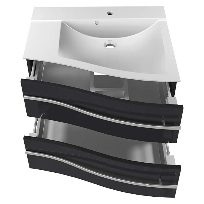 Die Waschplätze Lineo von Camargue sind ein Meisterstück moderner Badgestaltung aus Designerhand. Dazu tragen in erster Linie die elegante Linienführung des Waschbeckenunterschranks und des Beckens bei. Alle Elemente vereint ein filigraner Schwung, den sogar der hochwertige Metallgriff am Waschbeckenunterschrank aufgreift. Durch das geschwungene Design bietet das 70 cm breite Möbel genügend Platz auch in kleinen Bädern. Der Waschbeckenunterschrank mit den zwei grosszügigen Schubladen bieten viel Stauraum für alle nötigen Badutensilien. Auch der Beckenrand bietet viel Stellplatz für Seifenspender und Zahnputzbecher. Die Serie Lineo ist in linker und rechter Variante, in 5 verschiedenen Oberflächen, sowie mit Spiegelschrank oder Spiegel erhältlich.