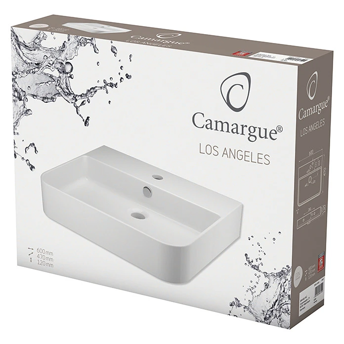 Der Waschtisch Los Angeles von Camargue ist elegant und funktionell zugleich. Universell in nahezu jedem Badezimmer einsetzbar, präsentiert er sich im modernen, eckigen Design. Frei an der Wand platziert, bringt er den Raum perfekt zur Geltung. Der Waschtisch besitzt ein durchgestochenes Hahnloch sowie einen Überlauf. Der breite Rand des Waschtisches bietet genügend Stellfläche, so dass Seifenspender und Seifenschalen problemlos darauf Platz finden. Der Bohrlochabstand zur Befestigung des Waschtisches beträgt 28 cm.
