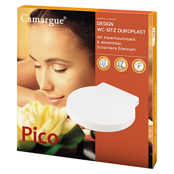Der WC-Sitz Pico von Camargue ist aus Duroplast gefertigt. Das sehr harte und bruchsichere Material ist extrem strapazierfähig und eignet sich somit auch hervorragend für viel frequentierte Bäder und Toiletten. Die schöne und moderne Form macht diesen Sitz zu einem echten Highlight. Die Fix-Clip Befestigung ermöglicht eine optimale Reinigung, da der WC-Sitz mit nur einem Klick, abmontiert werden kann. Der Gummieinsatz, der mit der Fix-Clip Befestigung montiert wird, verhindert das Hin-und-Her-Rutschen des WC-Sitzes. Die integrierte Absenkautomatik schliesst den Deckel sanft und leise. Der WC-Sitz ist passend zum Wand-WC Pico von Camargue.