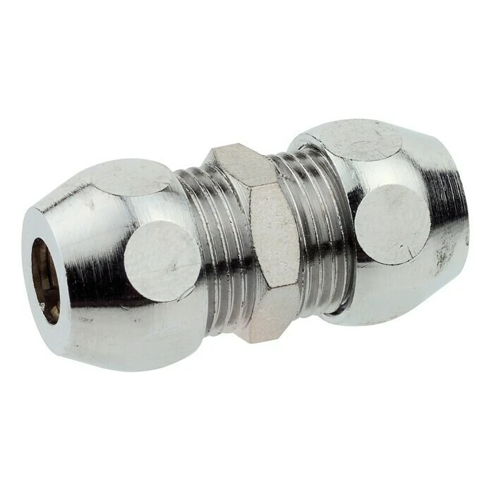 Die Doppel-Quetschverschraubung ist korrosionsbeständig und härter als Kupfer und findet ihren Anwendungsbereich bei Trinkwasserleitungen. Vorgesehen ist das Produkt für die Installation von 8 mm Kupferrohrstandards, wobei die Gewindeübergänge gemäss der Norm 3/8 Zoll betragen. Die Abdichtung erfolgt hier über einen Konusring.