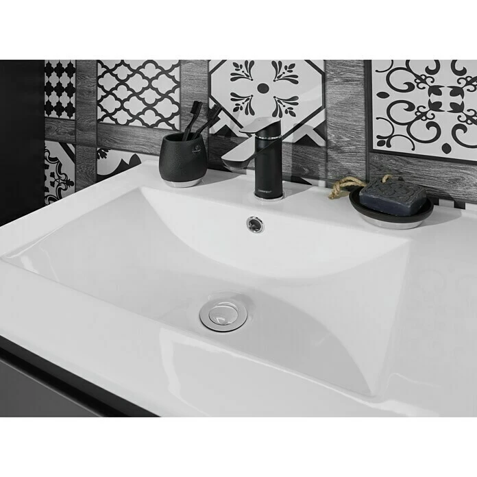 Der Waschtisch aus der Badmöbel-Serie Space bildet mit dem passenden Waschtischunterschrank eine harmonische Einheit. Der Waschtisch aus Keramik überzeugt durch eine solide und leicht zu reinigende Oberfläche und eine hohe Widerstandsfähigkeit. Darüber hinaus ist er bereits mit einem durchgestochenen Hahnloch sowie einem Überlaufloch ausgestattet. Mit dem ebenfalls erhältlichen, nicht im Lieferumfang enthaltenen Unterschrank, Hochschrank und Lichtspiegel, schaffen Sie ein harmonisches Gesamtbild. Lieferung erfolgt ohne Armatur und Ablaufventil.