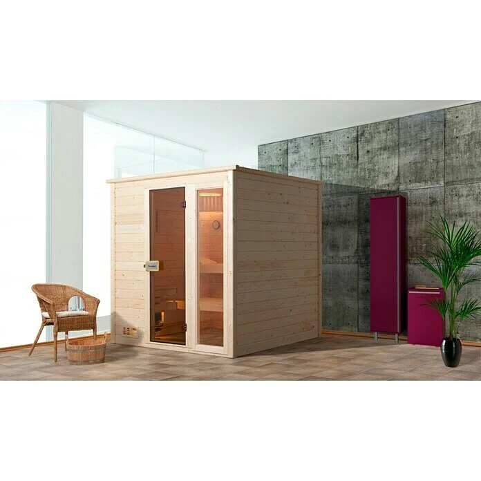 Die Massivholzsauna Bjoern Trend 1 von FinnWood ist die perfekte Wellness-Oase für zuhause. 45 mm starke, nordische Blockbohlen sorgen für ein natürliches Saunaklima und garantieren eine besonders hohe Stabilität und Wärmedämmung. Das zusätzliche Fensterelement vermittelt ein grosszügiges Raumgefühl. Auf zwei 55 cm tiefen Liegen lässt es sich komfortabel entspannen. Die Sauna ist für klassisches, finnisches Saunieren konzipiert. Dazu lässt sich der im Lieferumfang bereits enthaltene 5.4 kW Kompaktofen über einen eingebauten Temperaturregler stufenlos bis 110 °C einstellen. Die praktische Steuereinheit verfügt über ein beleuchtetes Display, eine 24 h-Zeitvorwahl sowie eine automatische Sicherheitsabschaltung. Die exklusive Ganzglastür besteht aus Sicherheitsglas im Farbton Parsol-Bronze und ist mit einem Sicherheitsrollverschluss ausgestattet. Aufgebaut wird die Sauna im einfachen Steck-/Schraubsystem aus einzelnen Massivholzbohlen, die Deckenelemente sind dabei bereits vormontiert. Das Komplett-Set beinhaltet sowohl den Saunaofen inkl. Saunasteinen als auch die Steuereinheit, das Ofenanschlusskabel und die Saunaleuchte – so können Sie direkt nach dem Aufbau in das wohlig warme Saunavergnügen starten.