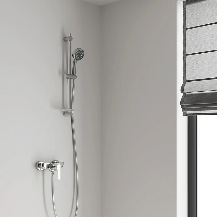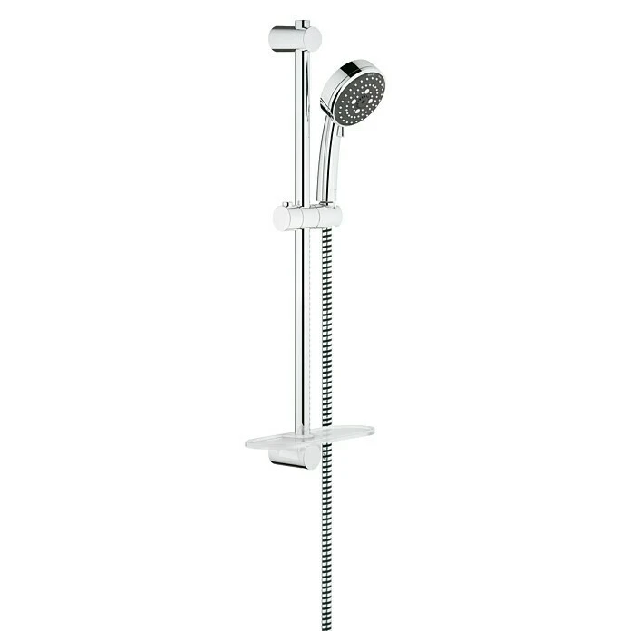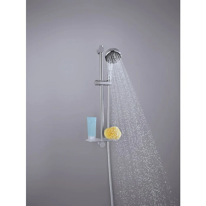Mit der Brausegarnitur Vitalio Comfort 100 von Grohe entscheiden Sie sich für eine Handbrause inklusive Brausestange, Ablage und Wandhaltern aus Metall. Zu den komfortablen Extras der Handbrause gehören vier verschiedene Strahlarten – Rain O², Rain, Massage, Jet –, zwischen denen Sie einfach wechseln können. Der Grohe DreamSpray® verteilt auf jede einzelne Düse die gleiche Wassermenge und erzeugt so einen angenehm gleichmässigen Strahl. Lästige Kalkablagerungen werden durch das integrierte SpeedClean Antikalk-System effektiv verhindert. Auch das Stangenset überzeugt durch besonderen Komfort: Dank Grohe QuickFix Plus geht die Montage kinderleicht. Mit den flexiblen Wandhaltern können Sie den Abstand der Bohrlöcher für die Duschstange selbst bestimmen und vorhandene Bohrlöcher oder die Fugen nutzen. Dieses Set ist damit von der ersten Sekunde an eine Bereicherung für Ihr Bad.