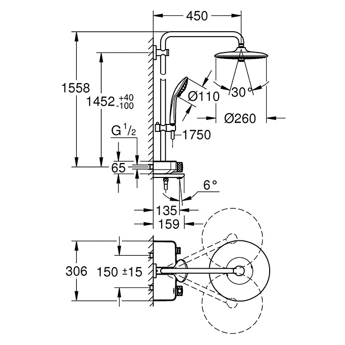 Das Duschsystem Euphoria SmartControl 260 Duo von GROHE ist ein luxuriöses Duschsystem mit einfacher Bedienung und dreifacher Massage. Mit der neuartigen SmartControl Bedienung können Sie per Druck- und Drehknopf die gewünschte Brause, Strahlart und Wassermenge ganz einfach einstellen und sogar kombinieren. Zur Auswahl stehen jeweils drei Strahlarten für Kopf- und Handbrause. So ist z. B. der GROHE TrioMassage Strahl der XXL-Kopfbrause entspannend und stimulierend zugleich. Auch in puncto Sicherheit lässt das System keine Wünsche offen: Die GROHE TurboStat® Technologie verhindert Temperaturschwankungen, die SafeStop Sperre schützt vor zu heissem Wasser und GROHE CoolTouch® sorgt dafür, dass die Armatur sich nicht aufheizt. Aber nicht nur Ihre empfindliche Haut, auch die Umwelt wird geschont: Die integrierte GROHE EcoJoy® Wasserspar-Funktion macht es möglich! Diese und weitere praktische Funktionen sind eingebettet in ein formvollendetes Design.