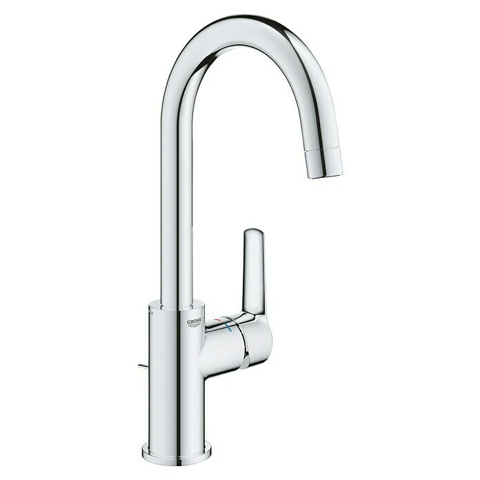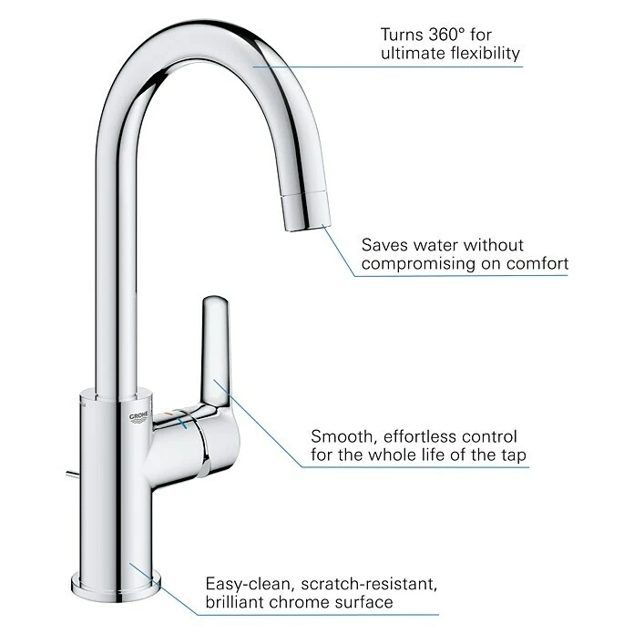 Die Grohe QuickFix Kollektion Grohe Start wurde weiter optimiert. Sie lässt sich jetzt noch komfortabler bedienen und noch schneller installieren. Die neue Grohe Start Waschtischarmatur Size-L wurde in Form und Funktion für die Anforderungen moderner Badezimmer perfektioniert. Sie zeichnet sich durch ein schlankes, zeitgemässes Design aus und bietet, dank des höheren Auslaufs, noch mehr Komfort. Die praktische Zugstangen-Ablaufgarnitur wird über eine kleine Stange an der Rückseite der Armatur betätigt. So lässt sich der Ablauf einfach öffnen und schliessen und Ihre Hände bleiben trocken. Mehr Platz und Flexibilität dank hohem schwenkbaren Auslauf. Mit der langlebigen Grohe SilkMove Keramikkartusche lassen sich Wassermenge und -temperatur über einen robusten Metallhebel präzise regeln. Der integrierte Temperaturbegrenzer spart Energie und die Grohe Wasserspartechnologie begrenzt den Wasserverbrauch auf 5,7 l/min – all das, ohne die Leistung zu beeinträchtigen.