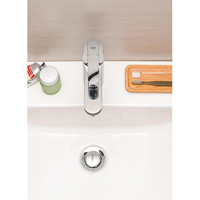 Der Waschtischmischer Get von GROHE verpasst durch sein besonderes Design jedem Waschbecken eine extravagante Optik. Eine geniale Mischung aus einfachen Rundungen und fliessenden Formen verbindet sich hier mit technischen Finessen. Die GROHE StarLight® Chromoberfläche ist hochglänzend, langlebig und besonders widerstandfähig. Dank des Bedienelements aus Metall mit GROHE SilkMove® Keramikkartusche bleibt die Bedienung stets sanft, präzise und bequem – auch nach jahrelangem Einsatz. Die Keramikkartusche verfügt über eine variabel einstellbare Mengenbegrenzung. Diese dient der einfachen Senkung des Wasserverbrauchs bei Betätigung der Waschtischarmatur. Der siebförmige Einsatz, der den Wasserstrahl zum Moussieren, also zum Perlen bringt, sorgt für ein besonderes Wassererlebnis. Das GROHE QuickFix® Schnellmontagesystem mit Zentrierhilfe ist schnell verständlich und vereinfacht die Befestigung des Waschtischmischers.