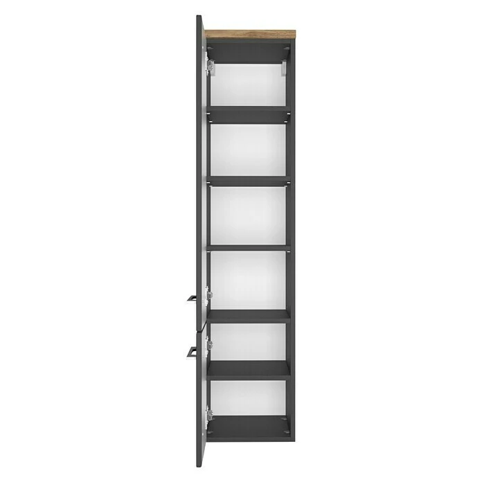 Der Hochschrank Davos beeindruck durch seine moderne Farbkombination in grafit und einem warmen Holzton. Durch die vier Einlegebögen bietet der Schrank viel Stauraum für alle Ihre Badutensilien. Die gedämpften Scharniere und die schönen Metallgriffe vom Midischrank sorgen für den Luxus, den Sie bei Ihrer Morgenroutine brauchen. Zudem kann der Schrank flexibel links oder rechts montiert werden.