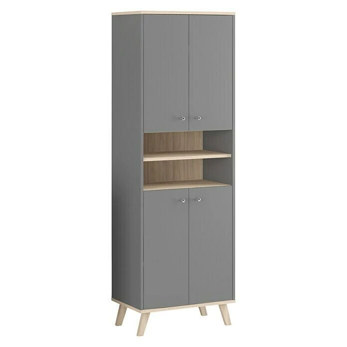 Der Hochschrank Madera bietet nicht nur Platz zur Aufbewahrung von diversen Badutensilien, er sorgt auch aufgrund seiner Optik für eine behagliche Atmosphäre in Ihrem Bad. Der skandinavische Stil ist geprägt durch die Kombination von Anthrazit und warmem Holzton, die Ihr Bad zu einem gemütlichen Ort verwandelt. Der Hochschrank besteht aus vier Türen mit Magnetschnapper und zwei offenen Regalfächern. Die Einlegeböden im Regal sind herausnehmbar und bieten somit flexiblen Stauraum. Der Türanschlag ist bei der Montage frei wählbar. Der Hochschrank Madera ist zur einfachen Selbstmontage geeignet und lässt sich mit weiteren Badmöbeln aus der gleichnamigen Serie kombinieren. Dadurch ergeben sich zahlreiche Kombinationsmöglichkeiten und die Platzkapazität in Ihrem Bad kann optimal genutzt werden.