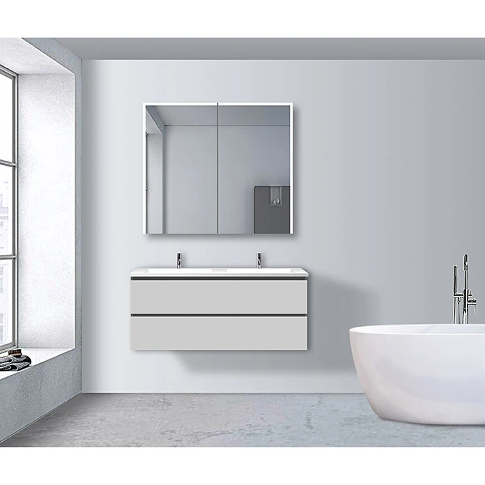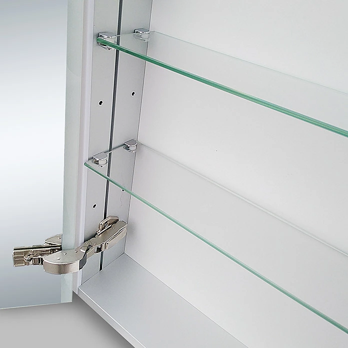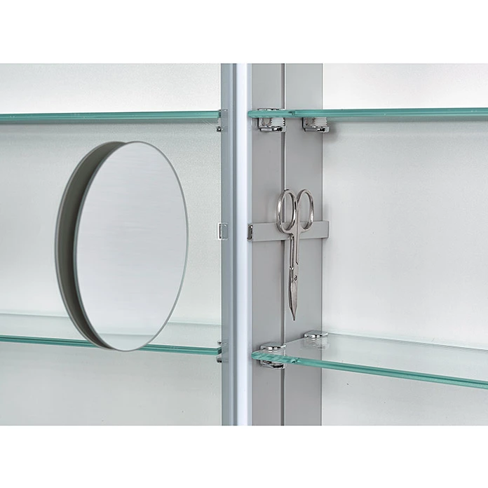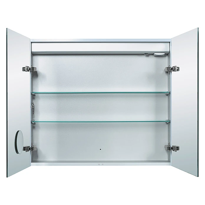 Mit dem LED-Spiegelschrank Aluminio Star holen Sie sich Innovation und Design in Ihr Bad. Der Spiegelschrank begeistert durch seine innovative und energiesparende LED-Technik sowie flexibel nutzbarem Stauraum. Vielerlei Kosmetikartikel, Pflegeutensilien oder Medikamente lassen sich übersichtlich hinter den doppelverglasten Spiegeltüren verstauen. Die LED-Lichtstreifen am Spiegel setzen eindrucksvolle Akzente und sorgen für eine gleichmässige Ausleuchtung. Zur funktionellen Ausstattung gehören ein Vergrösserungsspiegel zur individuellen Anbringung, sowie eine Magnetleiste für Badutensilien. Zudem verfügt der Spiegelschrank über einen integrierten Stromanschluss, so dass Sie Ihren Rasierer oder Föhn bequem anschliessen können. Der Spiegelschrank ist zur einfachen Montage bereits vormontiert.