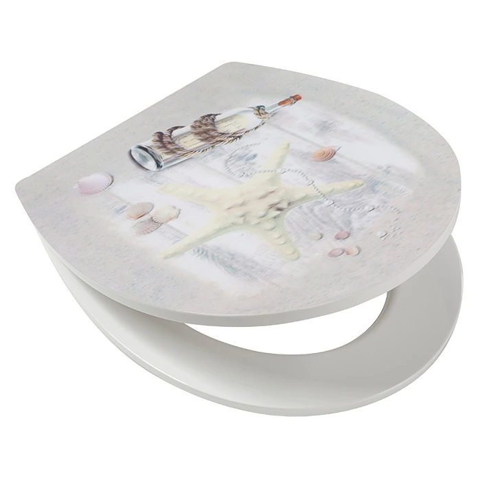 Der WC-Sitz Seaside von POSEIDON verbreitet durch seine Meeresmotive Strandatmosphäre in Ihrem Badezimmer, Der WC-Sitz ist aufgrund seiner hochwertigen Verarbeitung aus Duroplast extrem strapazierfähig und nahezu bruchsicher. Besonders praktisch erweisen sich die zwei Druckknöpfe, mit der sich der WC-Sitz problemlos vom Scharnier lösen lässt. Einer einfachen und schnellen Reinigung Ihres WCs steht somit nichts mehr im Wege. Die integrierte Absenkautomatik sorgt für ein sanftes und geräuschloses Schliessen.