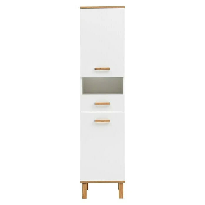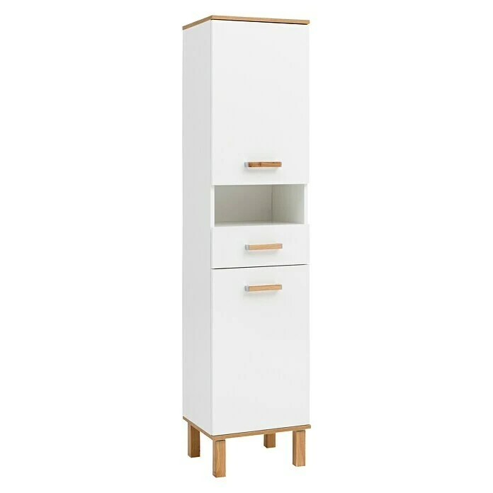 Der Hochschrank Padua von Schildmeyer zeichnet sich durch seine moderne Farbkombination in Weiss Glanz und Eiche Landhaus Holznachbildung aus. Der Schrank bietet mit zwei Türen mit Einlegeboden, einer Schulade und einem offenen Fächern viel Platz um Ihre Badutensilien zu versorgen. Für mehr Flexibilität in der Anwendung sorgen die Türen vom Schrank. Sie können rechts oder links angesschlagen werden. Der Hochschrank Padua ist zur einfachen Selbstmontage geeignet und kann mit weiteren Badmöbeln aus der gleichen Serie ergänzt werden. Dadurch ergeben sich zahlreiche Kombinationsmöglichkeiten und die Platzkapazität in Ihrem Bad kann optimal genutzt werden.