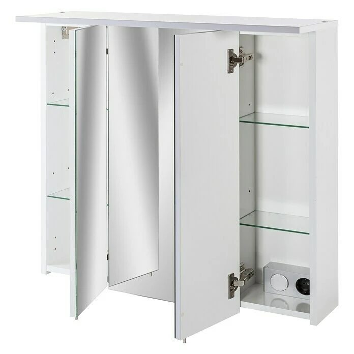 Mit dem LED-Spiegelschrank Sunny von Schildmeyer holen Sie sich Innovation und Design in Ihr Bad. Der Spiegelschrank begeistert durch seine harmonische Form, der energiesparenden Beleuchtung sowie flexibel nutzbarem Stauraum. Vielerlei Kosmetikartikel, Pflegeutensilien oder Medikamente lassen sich übersichtlich hinter der Spiegeltür verstauen. Die eingebauten Leuchten enthalten LEDs. Hinter der rechten Tür verbirgt sich eine praktische Schalter-/Steckdosenkombination. Für den perfekten Rundumblick lassen die äusseren Türen sich jeweils nach innen öffnen. Der Spiegelschrank ist zur einfachen Selbstmontage geeignet.
