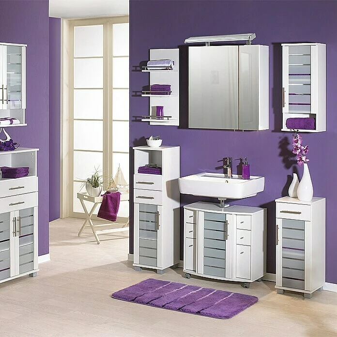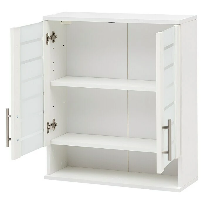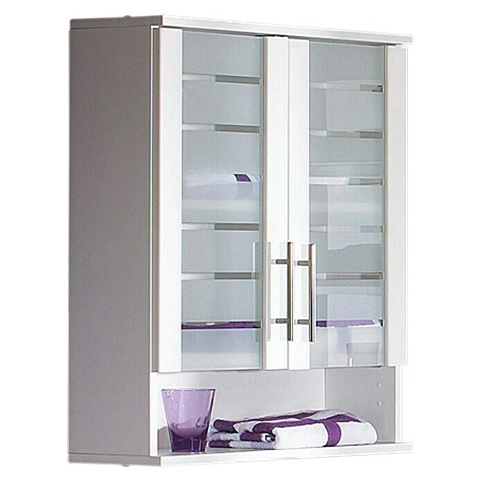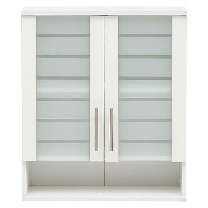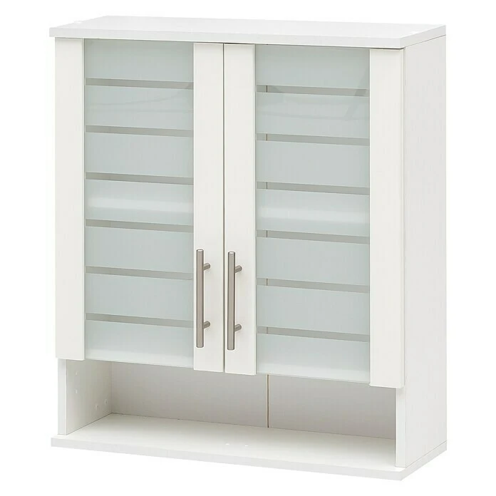 Der Oberschrank Niko von Schildmeyer ist ein schlichter, eleganter Badschrank. Durch sein Design und die ansprechende Optik ist dieser Oberschrank eine formschöne Ergänzung in jedem Bad. Ein offenes Ablagefach an der Unterseite bietet zusätzlichen Stauraum. Die zwei Schranktüren heben sich durch ihre gestreiften Glaseinsätze hervor. Die Metallbügelgriffe in eleganter Edelstahloptik runden das Ganze ab.