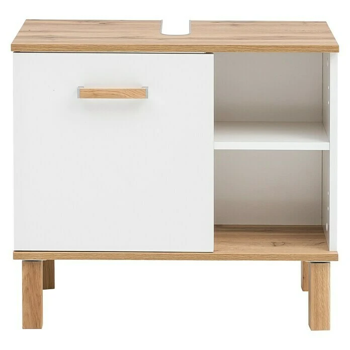 Der Waschbeckenunterschrank Padua von Schildmeyer zeichnet sich durch seine moderne Farbkombination in Weiss Glanz und Eiche Landhaus Holznachbildung aus. Der Schrank bietet mit einer Tür und den zwei offenen Fächern viel Platz um Ihre Badutensilien zu versorgen. Der Waschtischunterschrank Padua ist zur einfachen Selbstmontage geeignet und kann mit weiteren Badmöbeln aus der gleichen Serie ergänzt werden. Dadurch ergeben sich zahlreiche Kombinationsmöglichkeiten und die Platzkapazität in Ihrem Bad kann optimal genutzt werden.