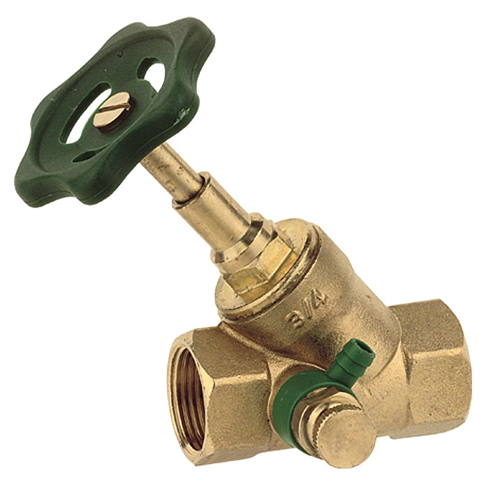 Das Schrägsitzventil mit Entleerung wird als Rohrverbindung im Sanitärbereich verwendet. Das Ventil ist ein Bauteil zur Absperrung oder Regelung des Durchflusses. Der Absperrkörper ist 45° zur Strömungsrichtung geneigt und wird reduziert und unterbrochen, in dem das Verschlussteil über eine passend geformte Öffnung angepresst wird. Im Gegensatz zu Absperrorganen, besitzt das Schrägsitzventil über den gesamten Stellbereich, ein gleichmässiges Strömungsbild. Deshalb eignet sich das Ventil neben dem Absperren des Durchflusses auch gut für Regelaufgaben. Das Schrägsitzventil ist aus Messing gefertigt und verfügt über ein 19.05 mm (G ¾») – Gewindeanschluss.