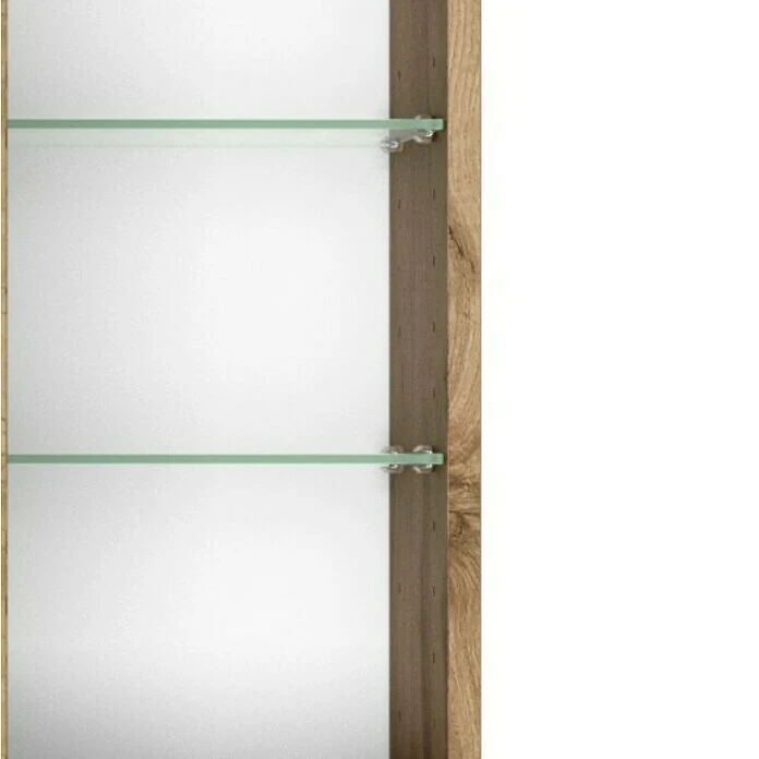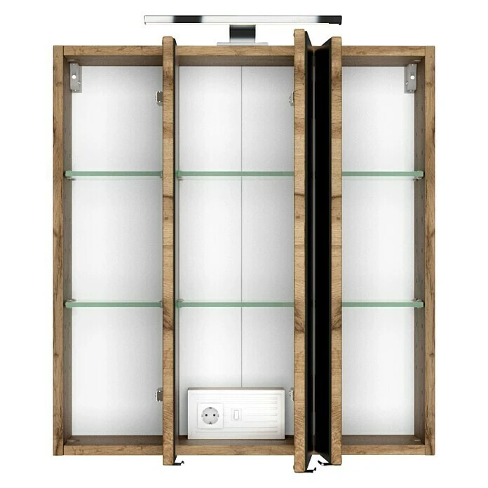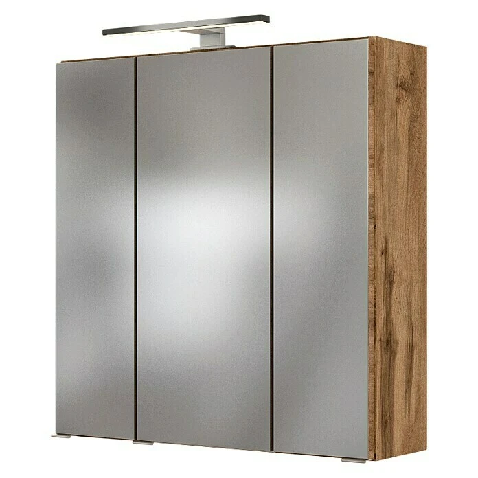 Der Spiegelschrank Genua mit sparsamer LED-Aufbauleuchte bietet viel Stauraum in Ihrem Bad. Die drei Spiegeltüren sorgen mit einer speziellen Klapptechnik für einen 3D-Effekt. Durch die LED-Beleuchtung ist zudem alles perfekt ausgeleuchtet. Im Inneren des Spiegelschranks befinden sich sechs verstellbare Glaseinlegeböden. So kann der Schrank nach Ihren individuellen Wünschen angepasst werden. Die Schalter/Steckdosen-Kombination befindet sich ebenfalls im Inneren des Schranks. Durch sein Korpus in Wotaneiche kann der Spiegelschrank perfekt mit dem Badmöbel aus der gleichen Serie ergänzt werden.