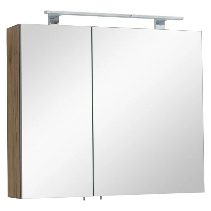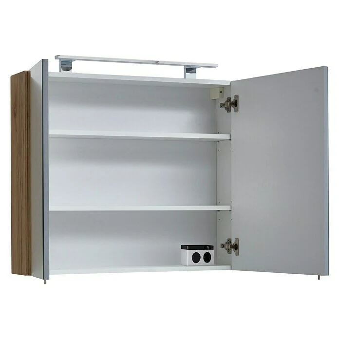 Der attraktive Spiegelschrank zur Badmöbelserie OPTIbasic in Wildeiche Nachbildung verfügt über 2 Spiegeltüren. Auf den zwei verstellbaren Einlegeböden hinter den zwei Türen von diesem Spiegelschrank finden viele Badutensilien ihren Platz. Mit der LED Aufbauleuchte wird der Waschplatz perfekt ausgeleuchtet. Zudem ist der Spiegelschrank mit einer praktischen Stecker-/Schalterkombination ausgestattet und bietet somit noch mehr Funktionalität und Komfort. Der Spiegelschrank ist die harmonische Ergänzung zum Waschplatz OPTIbasic.