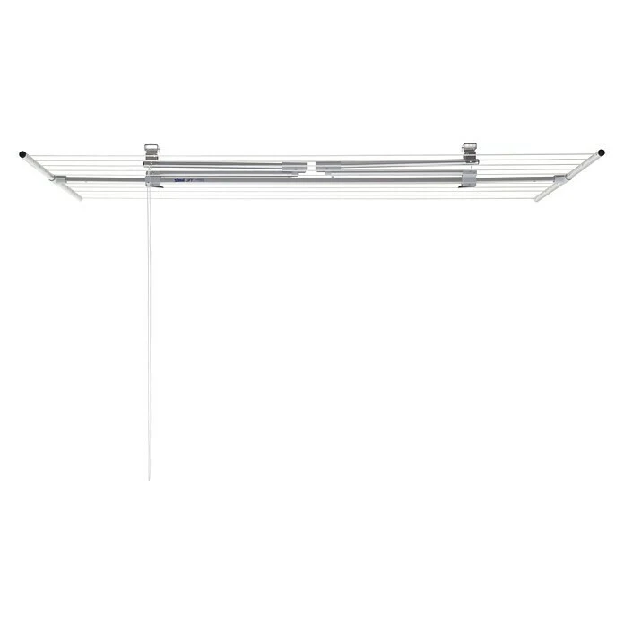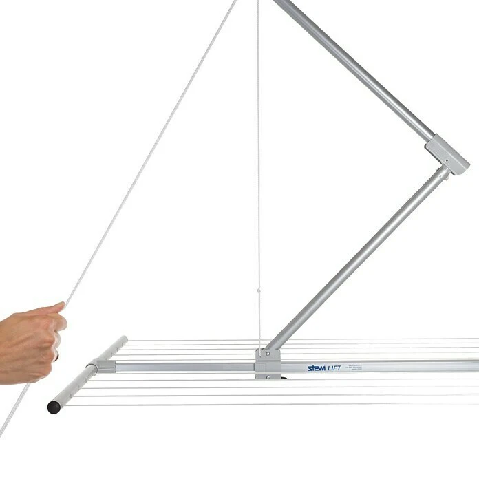 Der STEWI Lift ist platzsparender Wäschetrockner der an die Decke montiert wird. Er ist in der Länge von 128 cm bis 184 cm verstellbar. Somit ist die Trockenläng 13-18 Meter individuell angepasst. Mittels praktischem Zugseil kann der Deckentrockner bis zu 110 cm von der Decke abgesenkt werden. Der robuste und Rahmen aus Aluminium ist wetterbeständig und misst eingezogen 128 x 70 cm. Die Wäscheleinen sind reissfest und kunststoffummantelt. Die Gelenkarme sind einfach zu an die Decke zu montieren. STEWI Lift wird inklusive Deckenbefestigung und Montagematerial geliefert.