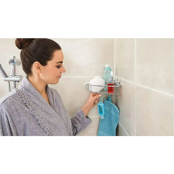 Der Eckduschkorb DK110 von tesa aus der Badserie Draad kann dank patentierter Befestigungstechnik leicht, bequem und ganz ohne Bohren, Lärm und Schmutz in Ihrem Bad befestigt werden. Durch seine hochglanzverchromte Optik ist er ein absoluter Eyecatcher in jedem Bad. Die Haftflächen müssen tragfähig, sauber, trocken, fett- und trennmittelfrei sein. Die Fläche am besten mit einem trockenen, sauberen Tuch fest abreiben. Verwenden Sie auf keinen Fall Badreiniger – diese enthalten meist Antihaftsubstanzen. Trennschichten können meist mit reinem Alkohol (Isopropanol oder Propylalkohol) aus der Apotheke entfernt werden. Bei gewachsten Natursteinen wachslösenden Reiniger verwenden.