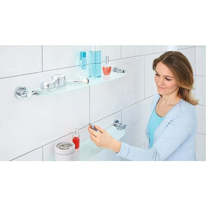 Die Glasablage LO200 von tesa aus der Badserie Loxx kann dank patentierter Befestigungstechnik leicht, bequem und ganz ohne Bohren, Lärm und Schmutz in Ihrem Bad befestigt werden. Durch ihre hochglanzverchromte Optik ist sie ein absoluter Eyecatcher in jedem Bad. Die Haftflächen müssen tragfähig, sauber, trocken, fett- und trennmittelfrei sein. Die Fläche am besten mit einem trockenen, sauberen Tuch fest abreiben. Verwenden Sie auf keinen Fall Badreiniger – diese enthalten meist Antihaftsubstanzen. Trennschichten können meist mit reinem Alkohol (Isopropanol oder Propylalkohol) aus der Apotheke entfernt werden. Bei gewachsten Natursteinen wachslösenden Reiniger verwenden.