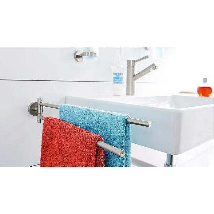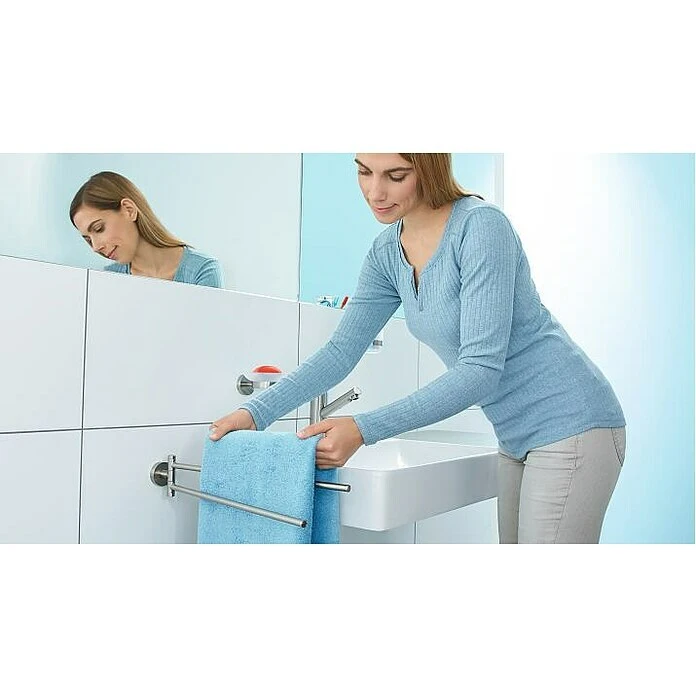 Der Handtuchhalter MO203 von tesa aus der Badserie Moon ist durch seine Edelstahloptik ein absolutes Highlight in jedem Bad. Er braucht nur wenige Zentimeter Platz an der Wand, um zwei Handtücher auf seinen langen Armen ausgebreitet zu halten. Mit der Kombination aus einem extrem leistungsfähigen Einkomponentenkleber und dem patentierten tesa-Adapter müssen keine lästigen Bohrlöcher mehr gebohrt werden. Die Befestigung bleibt dauerhaft hoch belastbar und lässt sich in aller Regel rückstandslos wieder entfernen. Die Haftflächen müssen tragfähig, sauber, trocken, fett- und trennmittelfrei sein. Die Fläche am besten mit einem trockenen, sauberen Tuch fest abreiben. Verwenden Sie auf keinen Fall Badreiniger – diese enthalten meist Antihaftsubstanzen. Trennschichten können meist mit reinem Alkohol (Isopropanol oder Propylalkohol) aus der Apotheke entfernt werden. Bei gewachsten Natursteinen wachslösenden Reiniger verwenden.