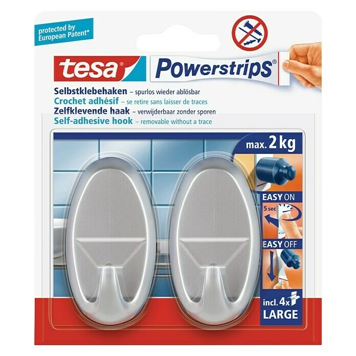 Die tesa Powerstrips Selbstklebehaken eignen sich ideal zum Aufhängen von vielen Gegenständen in Küche, Bad und auf Reisen. Sie sind für die Verklebung auf Kacheln, Glas, Holz, Kunststoff und vielen anderen Untergründen bestens geeignet. Nicht geeignet ist der Selbstklebahaken für Vinyltapeten, antihaftbeschichtete Oberflächen, Styropor, Schaumstoff und poröse Materialien. Er ermöglicht ein einfaches Befestigen ohne Schrauben, Dübel und Nägel. Der tesa Powerstrip Haken ist jederzeit spurlos ablösbar von glatten, ausreichend festen Untergründen und mehrfach verwendbar durch die tesa Powerstrips-Technologie. Ebenfalls überzeugt er durch eine starke Halteleistung bis zu 2 kg.