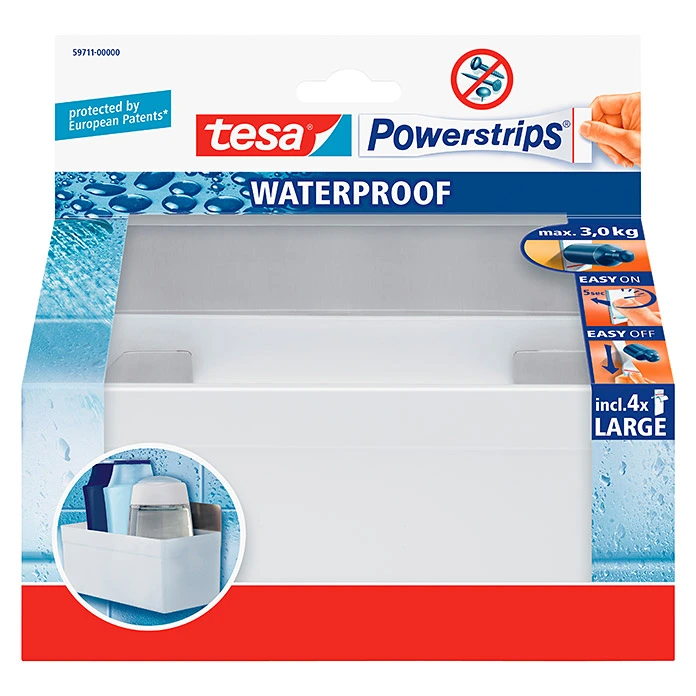 Die wasserfeste tesa Powerstrips Duschablage ist eine innovative Lösung zur Aufbewahrung von Duschgel, Shampoo und anderen Utensilien, die in der Dusche benötigt werden. Die Duschablage wird ohne Bohren, also nahezu lautlos und mittels einer rostfreien Edelstahlleiste befestigt und bietet sicheren Halt für Objekte mit einem Gesamtgewicht bis zu drei Kilogramm. Da sich die Powerstrips sehr einfach anbringen und rückstandslos ablösen lassen, ist diese Produktvariante eine saubere Alternative zu Bohrmaschine, Dübel und Schrauben. Es entstehen keine Bohrlöcher im Badezimmer, was insbesondere in Mietwohnungen ein grosser Vorteil sein kann.