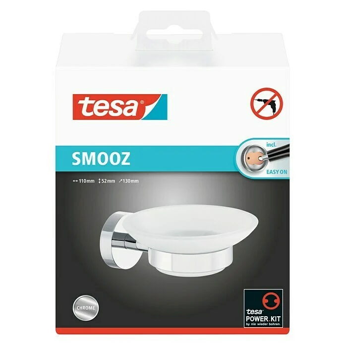 Die Seifenschale von tesa aus der Badserie Smooz kann dank patentierter Befestigungstechnik leicht, bequem und ganz ohne Bohren, Lärm und Schmutz in Ihrem Bad befestigt werden. Durch seine hochglanzverchromte Optik und dem schönen satinierten Glas ist er ein absoluter Eyecatcher in jedem Bad. Die Glasschale kann zur einfach Reinigung problemlos abgenommen werden. Die seifenschale kann mit weiteren Badaccessoires aus der gleichen Serie ergänzt werden für ein einheitliches Bild in Ihrem Bad. Zudem kann sie rückstandslos entfernt werden und mit einem neuen Adapter wieder verwendet werden.