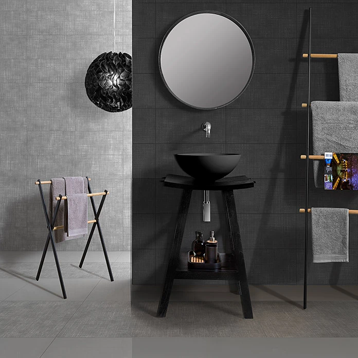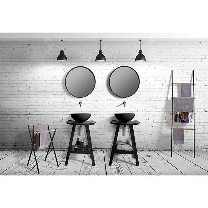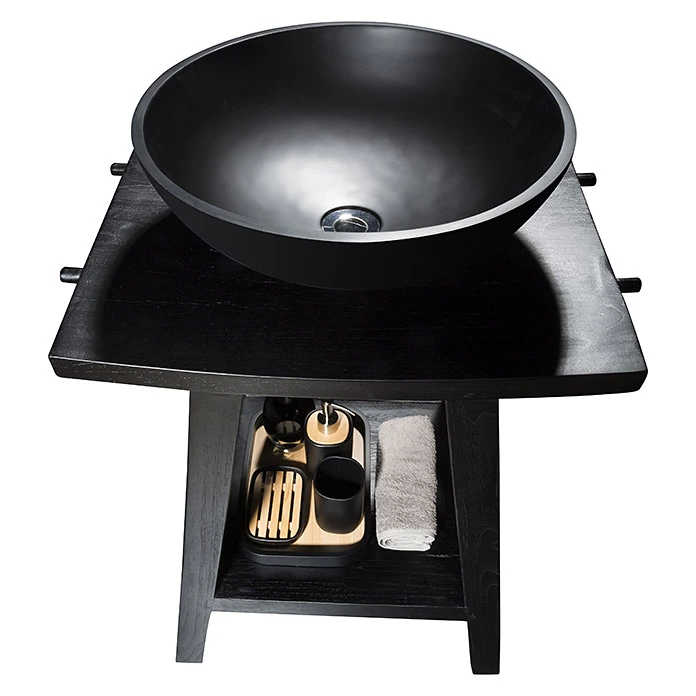 Die urbane freistehende Waschtisch-Konsole Zen wurde handwerklich produziert ohne Schrauben und Nägel. Die Konsole wird aus recyceltem Teak-Holz hergestellt und schwarz lackiert. Somit ist ist jedes Stück ein Unikat. Die vier an der Seite angebrachten Handtuchhaken sorgen dafür, dass Ihre Handtücher griffbereit zur Stelle sind. Die Ablage im unteren Bereich bietet genügend Platz für die wichtigsten Badutensilien.
