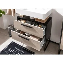 Industrial Style trifft auf cooles Holzdekor: Jannik Steinesche-Holzdekor, Metallrahmen und Anthrazit: diese Bausteine sind Garanten für den Look des modernen Industrial Designs im Bad. Die Möbel der Bad-Serie Jannik mit anthrazitfarbenem Korpus verleihen dem Bad eine edle, zugleich markante Note. Zudem können alle neun Möbelstücke mit formalen und praktischen Details aufwarten. Der Waschbecken-Unterschrank kann für alle wandhängenden Becken eingesetzt werden. Durch zwei Metallfüsse aus einem eleganten, schwarzen Metallrahmen wird ein leicht schwebender Eindruck, zugleich ein technisch-markantes Ambiente erzeugt. Den passenden, natürlichen Kontrast bieten dabei die beiden Schubladenfronten im Steinesche-Dekor mit zwei dezenten Griffen in schwarz matt. In den grosszügigen Schubläden finden alle Badezimmer-Utensilien bestens Platz.