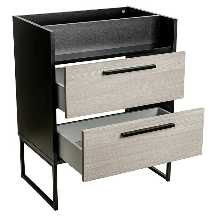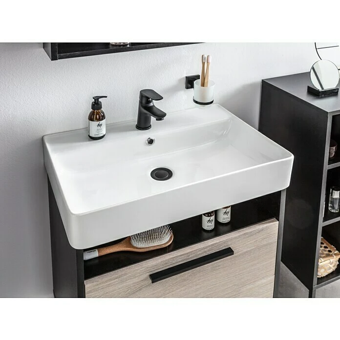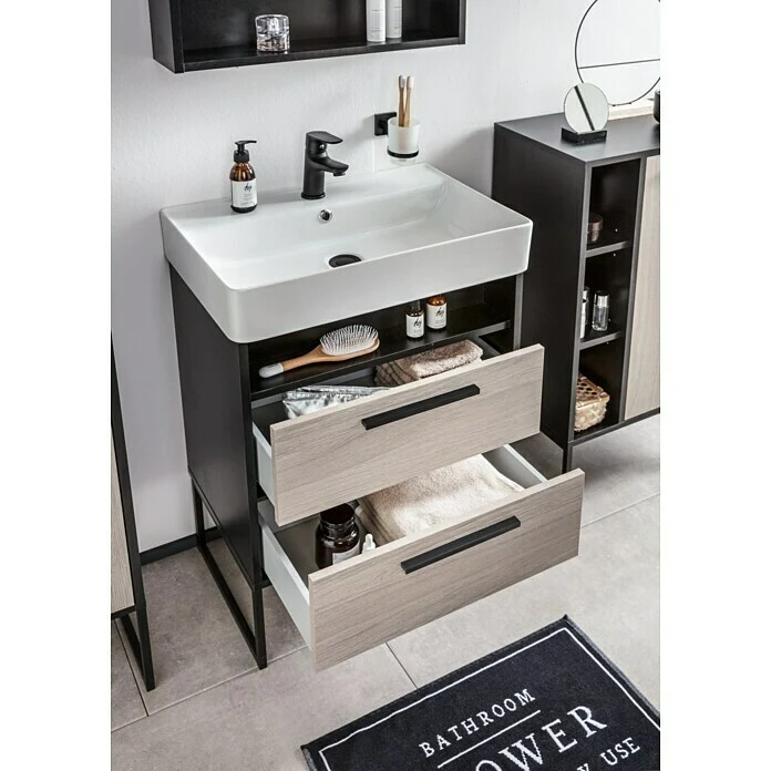Industrial Style trifft auf cooles Holzdekor: Jannik Steinesche-Holzdekor, Metallrahmen und Anthrazit: diese Bausteine sind Garanten für den Look des modernen Industrial Designs im Bad. Die Möbel der Bad-Serie Jannik mit anthrazitfarbenem Korpus verleihen dem Bad eine edle, zugleich markante Note. Zudem können alle neun Möbelstücke mit formalen und praktischen Details aufwarten. Auf den Waschbecken-Unterschrank kann das Keramikbecken aus der Serie Jannik optimal aufgesetzt werden. Durch zwei Metallfüsse aus einem eleganten, schwarzen Metallrahmen wird ein leicht schwebender Eindruck, zugleich ein technisch-markantes Ambiente erzeugt. Den passenden, natürlichen Kontrast bieten dabei die beiden Schubladenfronten im Steinesche-Dekor mit zwei dezenten Griffen in Schwarz Matt. In den grosszügigen Schubläden und der offenen Ablage unter dem Becken finden alle Badezimmer-Utensilien bestens Platz.