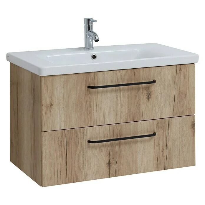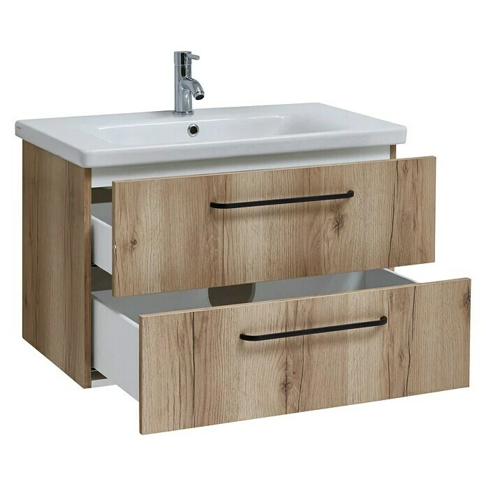 Der Waschtischunterschrank OPTIbasic in Wildeiche Nachbildung überzeugt durch sein im Trend liegenden Industriestil. Zusammen mit den schwarzen Griffen wird der coole Look in Verbindung mit dem warmen Holzton unterstrichen. Der Unterschrank ist mit 2 Schubladen ausgestattet und bietet viel Platz zum Verstauen von Badutensilien. Der Waschtischunterschrank ist zur Wandmontage geeignet. Er kann jedoch auch in Kombination mit dem schwarzmatten Möbelgestell gekauft werden. Das Gestell sowie die praktischen Handtuchhalter müssen separat bestellt werden. Der passende Keramik-Waschtisch ist ebenfalls separat erhältlich.
