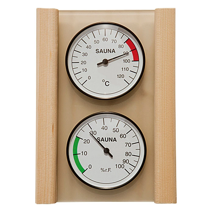 Das Hygro-/Thermometer-Set von weka ist ideal zur Kontrolle der Temperatur und Luftfeuchtigkeit und sorgt für ein optimales Saunaklima. Es hat ein Metallgehäuse mit verchromtem Rahmen und ein satiniertes Sicherheitsglas. Der Saunamessbereich wird auf der Klimastation farbig ausgelegt.