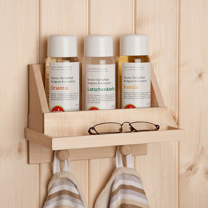 Das Sauna- und Dampfbadkonzentrat- Set von weka beinhaltet alles, was Sie für ein sinnliches Wellness-Erlebnis brauchen. Drei verschiedene Konzentrate in den Noten Oriental, Latschenkiefer und Kamille versprechen aufregende Dufterlebnisse. Die Duftnoten beinhalten je 250 ml und können in dem mitgelieferten Wandregal aus Holz perfekt aufbewahrt werden. Für weitere Aufbewahrungsmöglichkeiten sorgen die integrierte Brillenablage sowie die beiden Handtuchhaken.