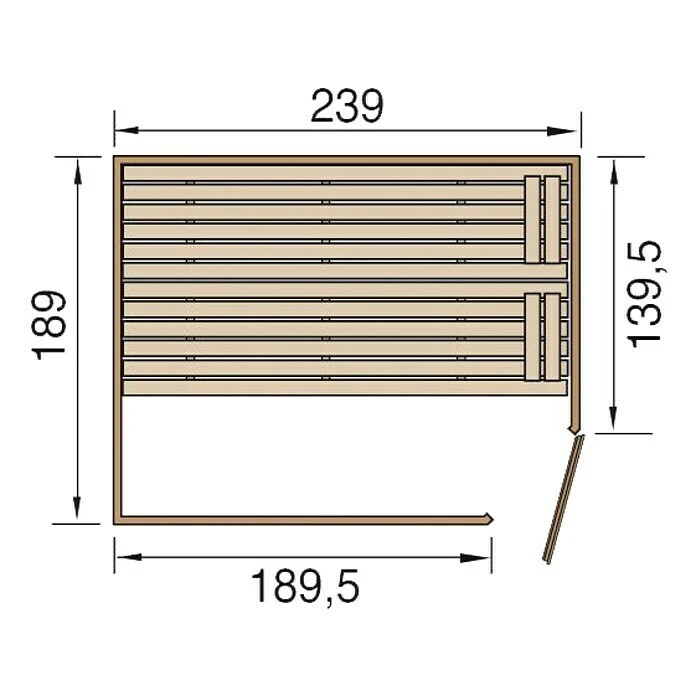 - Saunakörper, 1 Ganzglastür, 1 Fensterelement, 2 Liegen 55 cm tief, 2 Kopfstützen, Ofenschutzgitter, Montagematerial