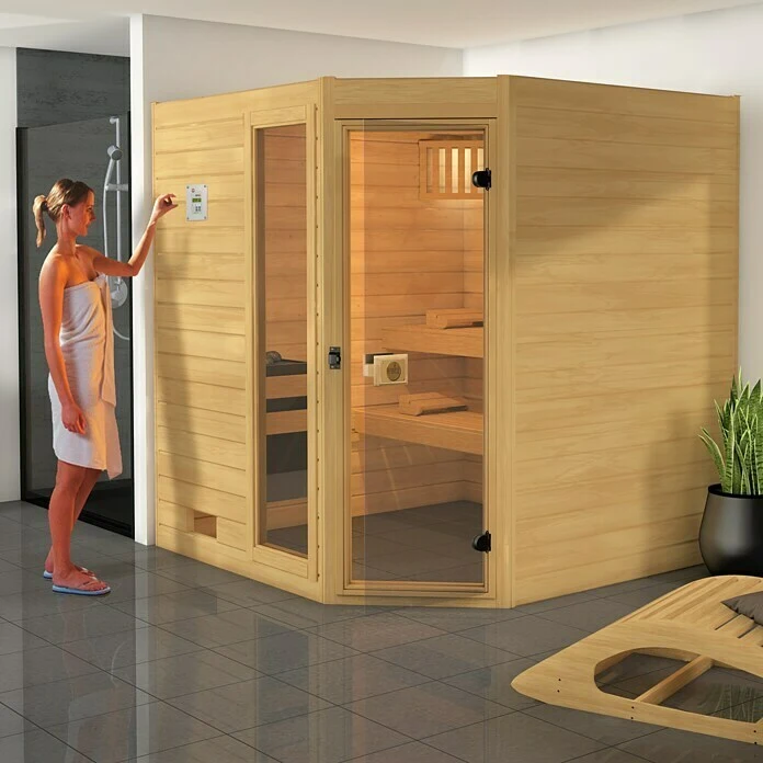 Mit der Massivholzsauna Valida Eck 3 GTF von weka geniessen Sie den milden, würzigen Duft von natürlichem Holz, der jeden Saunagang zu einem echten Erlebnis macht. Die naturbelassenen, 38 mm starken Massivholzbohlen mit Doppelnut und -feder sorgen für eine besonders hohe Dichte, Stabilität und Lebensdauer. Die exklusive Ganzglastür aus 6 mm starkem Sicherheitsglas ist rechts oder links anschlagbar und schliesst mit einem Sicherheitsrollverschluss. Das lange Fensterelement sorgt für zusätzlichen Lichteinfall. Die eingearbeiteten, verdeckt liegenden Kanäle für den Anschluss von Saunaofen, Steuergerät und Zubehör sorgen für hohe Sicherheit und beste Optik. Die zwei stabilen Liegen (55 cm tief), 2 Kopfstützen und ein Ofenschutzgitter ergänzen die Innenausstattung. Die Massivholzsauna lässt sich optimal mit dem passenden Sauna-Ofen ergänzen.