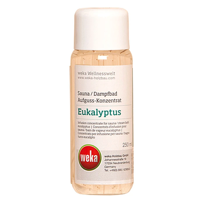 Mit dem Sauna- und Dampfbadduft Eukalyptus von weka erleben Sie den befreienden Duft, der Sie durchatmen lässt. Er fördert die vertiefte Atmung und begünstig so die Sauerstoffversorung aller Körperzellen. Der Duft verleiht eine entspannende und gemütliche Atmosphäre.